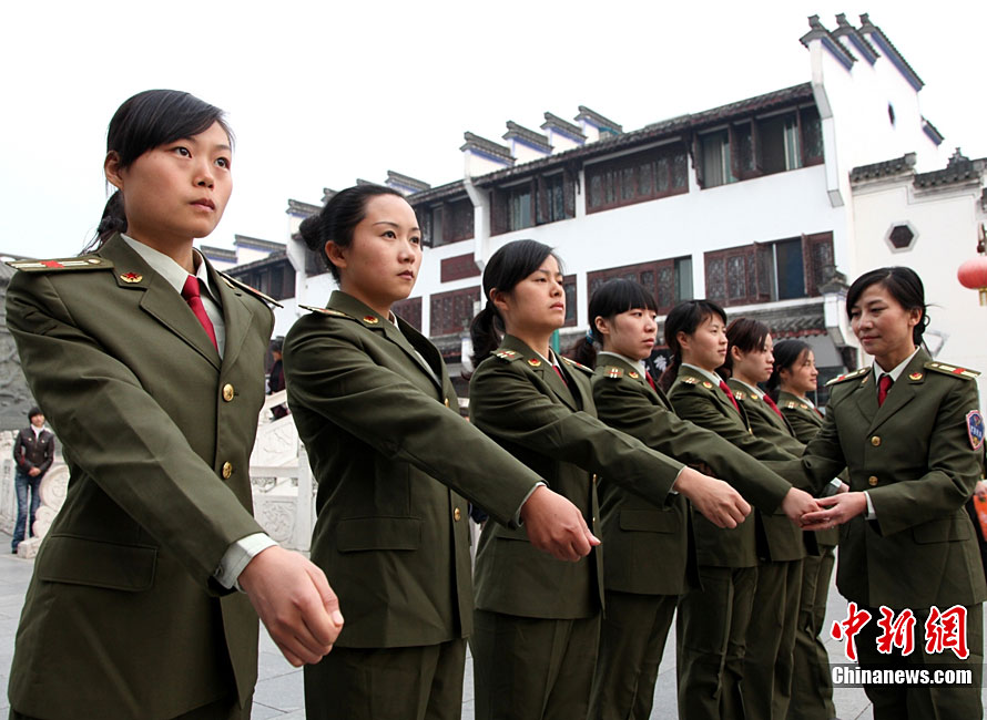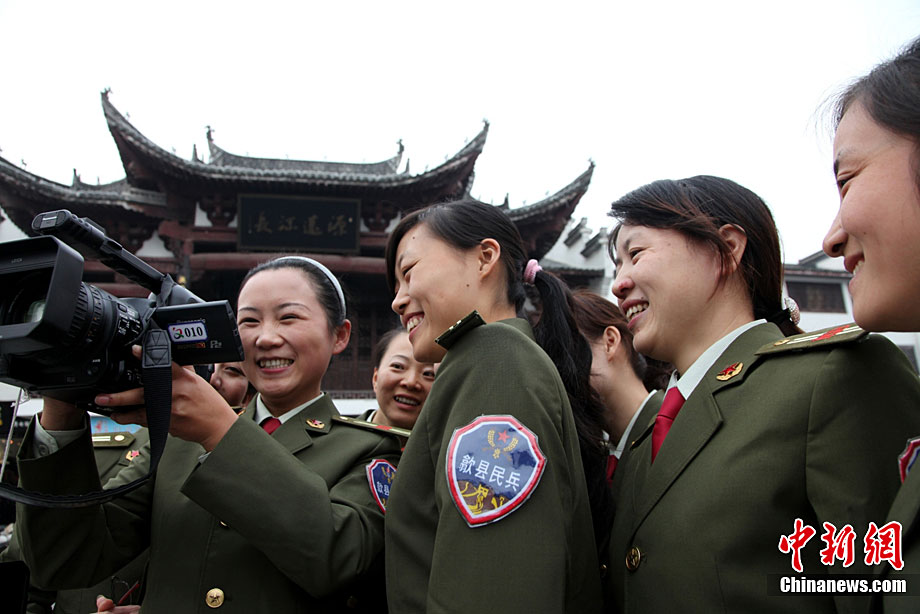 11月1日,安徽黃山歙縣古徽州女子民兵連的女民兵在訓練。歙縣古徽州女子民兵連是安徽省唯一一支女子民兵連,由100人組成,百分之百的大專以上學歷、百分之百的黨團員。去年3月8日成立以來,為歙縣古城的社會穩定和各種搶險做出了卓有貢獻。瞧,她們的英姿多瀟灑。吳建平 攝