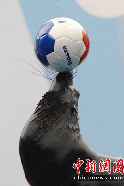 2010年南非世界杯六月底正在如火如荼地進行,人們再次興起一輪熱愛足球的浪潮。居住在深圳野生動物園里的動物們也不甘落后,它們也紛紛玩起足球過把癮。中新社發 李木生 攝