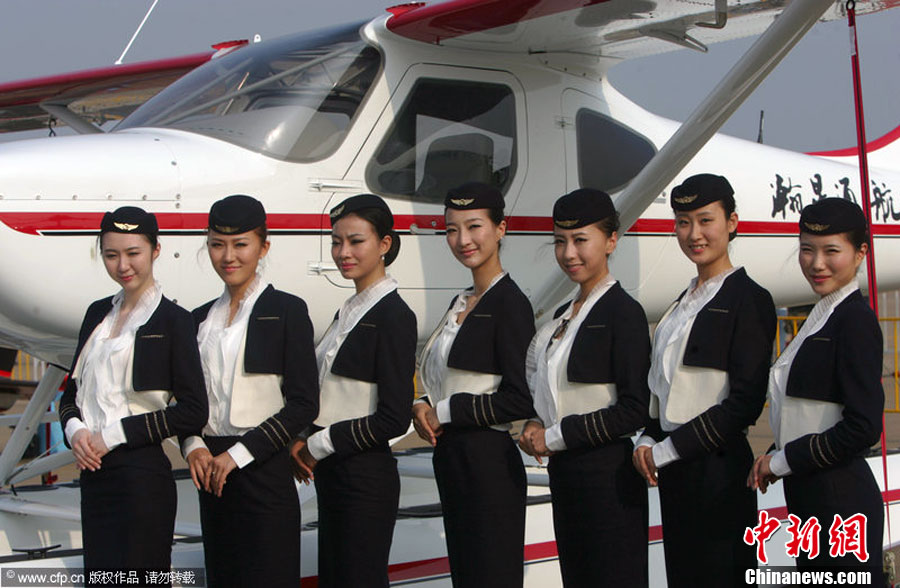 2012年11月13日,廣東省珠海市,瀚星通航的準(zhǔn)女飛行員和飛機(jī)亮相航展。圖片來(lái)源:CFP視覺(jué)中國(guó)