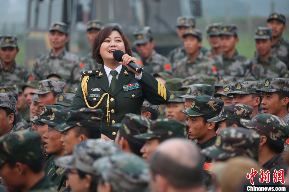 8月10日,隨同中方參演部隊赴俄羅斯參加“和平使命-2013”中俄聯(lián)演的沈陽軍區(qū)政治部文工團(tuán)演員們,為中俄千余名參演官兵獻(xiàn)上了一場精彩的文藝晚會。豐富多彩的文藝節(jié)目,將位于切巴爾庫爾訓(xùn)練場的中俄聯(lián)演野營村,變成了友誼的盛會、歡樂的海洋。 圖為演唱歌曲《當(dāng)那一天來臨》。中新社發(fā) 李祥輝 攝
