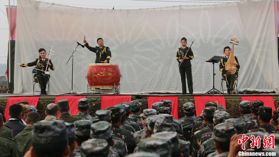 8月10日,隨同中方參演部隊赴俄羅斯參加“和平使命-2013”中俄聯演的沈陽軍區政治部文工團演員們,為中俄千余名參演官兵獻上了一場精彩的文藝晚會。豐富多彩的文藝節目,將位于切巴爾庫爾訓練場的中俄聯演野營村,變成了友誼的盛會、歡樂的海洋。圖為民樂合奏《出征》。中新社發 李祥輝 攝
