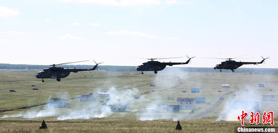 8月12日,“和平使命-2013”聯合反恐軍演中俄兩軍參演部隊在切巴爾庫爾合同訓練場舉行全員全要素實兵協同訓練。雙方共出動官兵近900人,坦克、步戰車、直升機等武器裝備約130臺,雙方導演部總導演——俄中部軍區司令員波格諾夫斯基和沈陽軍區副司令員石香元,共同到演習地觀摩并指導兩軍訓練。圖為陸航編隊實施空中偵察。中新社發 李祥輝 攝