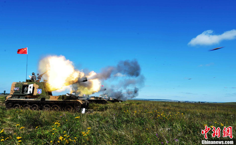 8月12日12時(北京時間下午2時),“和平使命-2013”中俄聯(lián)合反恐軍事演習(xí),在俄羅斯切巴爾庫爾合同訓(xùn)練場進行了實兵實彈協(xié)同訓(xùn)練,中俄雙方出動了所有參演兵力,對聯(lián)合封控、分區(qū)清剿、火力突擊等內(nèi)容進行了訓(xùn)練,時間大約50多分鐘。圖為中方炮火實施遠程火力攔阻。中新社發(fā) 譚長俊 攝