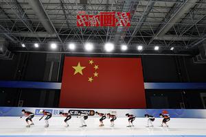 1月29日,北京,中國隊隊員在訓練中。當日,中國速度滑冰隊在國家速滑館“冰絲帶”進行訓練,備戰北京冬奧會比賽。 中新社記者 何蓬磊 攝