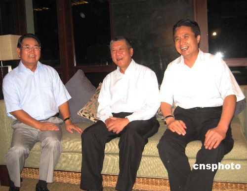 十月二十九日,澳門特別行政區行政長官何厚鏵率澳門政府代表團和澳門房地產企業家代表團一行一百五十四人訪問海南三亞。中共海南省委書記衛留成(左)、海南省長羅保銘(右)當天在三亞希爾頓大酒店會見并宴請了何厚鏵一行。中新社發 尹海明 攝