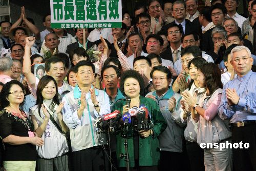 11月16日,高雄市長選舉官司在當地二審定讞。代表中國國民黨的候選人黃俊英在選舉無效和當選無效兩項訴訟中均遭判敗訴。民進黨的陳菊(前中)在去年12月9日勝出擔任市長后,今次獲承辦法官支持繼續擔任市長。今年6月15日,該官司一審曾判,選舉有效,但陳菊當選無效。圖為陳菊在獲知贏得官司后,于高雄市政府前對支持者允諾未來3年會以推動市民利益的建設為優先。中新社發 黃少華 攝