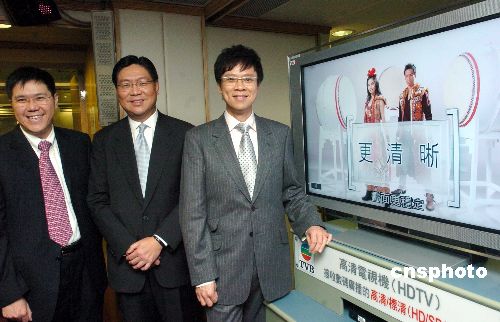 11月26日,香港就推出“數(shù)碼地面電視廣播”舉行記者會,商務及經(jīng)濟發(fā)展局局長馬時亨,與電視廣播有限公司的高層陳志云(右)和鄭善強(左)在記者會現(xiàn)場,參觀香港電視廣播有限公司(TVB)的高清數(shù)碼電視廣播的片段。中新社發(fā) 鄧慶樂 攝
