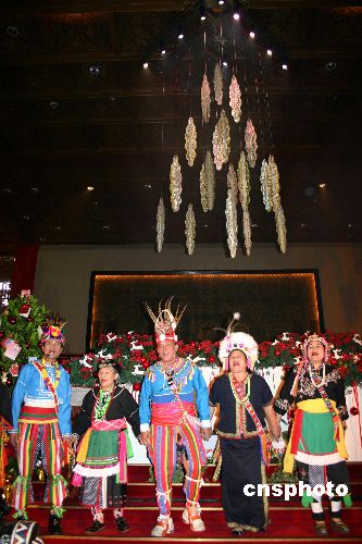 十二月五日下午,古色古香的臺北圓山飯店舉行圣誕點燈儀式,并請來原住民作為大地的代言人,從大地采光,點燃圣誕之燈。據了解,今年圓山飯店的圣誕樹造型的燈使用環保材料,圣誕之后,仍可用作日常的照明。中新社發 陳國華 攝