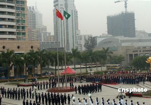 十二月二十日清晨,澳門蓮花廣場舉行隆重的升旗儀式,慶祝澳門特別行政區成立八周年。澳門特首何厚鏵、中央人民政府駐澳門聯絡辦公室主任白志健及各界人士出席升旗儀式。中新社發 史利 攝