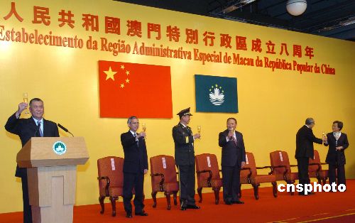 十二月二十日,慶祝澳門特別行政區成立八周年招待酒會在澳門旅游塔舉行,澳門特首何厚鏵在招待會上致詞,中央人民政府駐澳門聯絡辦公室主任白志健等嘉賓出席招待會,賓主舉杯共祝祖國富強繁榮。中新社發 史利 攝