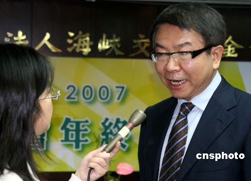 十二月二十七日,臺灣海基會在臺北舉行二00七年終記者會。圖為海基會董事長洪奇昌會后接受記者采訪。中新社發 董會峰 攝