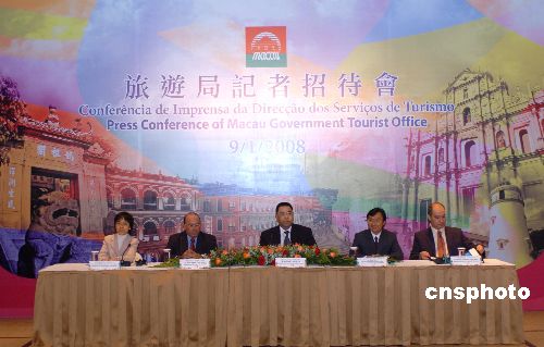 一月九日,崔世安(中)出席澳門旅游局在漁人碼頭舉行的記者招待會并答記者問。當日,澳門旅游局公布﹐2007年澳門入境旅客超過2700萬人次,增幅為22.7%。中國內地仍是最大市場,約占整體旅客的55%,其中48%為“個人游”旅客,其次是香港、臺灣旅客。中新社發(fā) 史利 攝