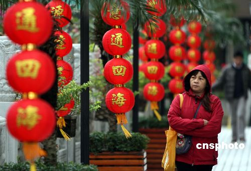 一月三十一日,一位香港市民走過街頭大紅的新春裝飾。當(dāng)日,香港天文臺(tái)表示,今早錄得的最低氣溫為八點(diǎn)五度,是入冬以來的最低紀(jì)錄。中新社發(fā) 武仲林 攝