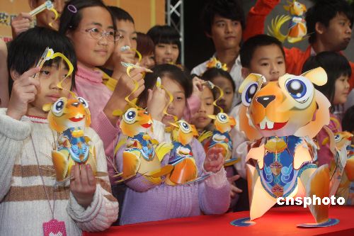 臺北市將從2月15日起舉辦為期十天的“囍迎曙光耀繁城”盛大燈節,臺北市政府還將向市民發放十萬盞由臺灣著名紙雕藝術家洪新富創作的“豐足鼠”小提燈。1月31日,首批臺北學童領到了“豐足鼠”小提燈。中新社發 耿軍 攝
