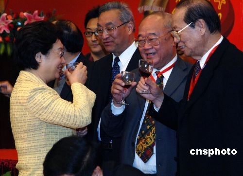 二月二十日晚,中國國僑辦主任李海峰(左一)在廈門與前來參加“海峽西岸鬧元宵,全球華人盼團圓”活動的海外華人華僑及港澳臺同胞共話鄉誼。中新社發 王東明 攝