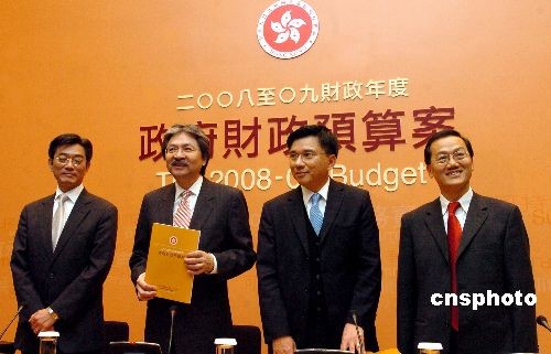 二月二十七日,香港財政司司長曾俊華(左二)、財經事務及庫務局局長陳家強(左三)、政府經濟顧問郭國全(右一)等出席二零零八至零九年度財政預算案記者會,回答記者有關提問。中新社發 鄧慶樂 攝