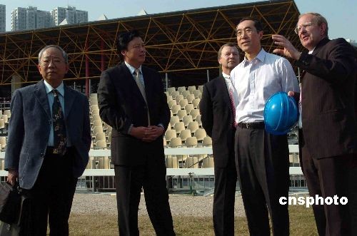 三月四日下午,香港署理行政長(zhǎng)官唐英年(右二)與多名局長(zhǎng)、警務(wù)處長(zhǎng),連同北京奧組委官員參觀由沙田香港體育學(xué)院改建而成的奧運(yùn)及殘奧馬術(shù)主要比賽場(chǎng)地和相關(guān)配套工程。中新社發(fā) 譚達(dá)明 攝
