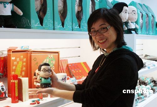 3月10日,有臺北“長仔工坊”業者展示此次民進黨候選人謝長廷、蘇貞昌的創意公仔商品。業者稱,此番展示的商品,有T恤、手表、文具、飾品、鉛筆、杯墊、鑰匙圈、隨手杯、手機吊飾等,用創意設計手法,呈現謝、蘇的特質、形象,展現臺灣的選舉文化。中新社發 黃少華 攝