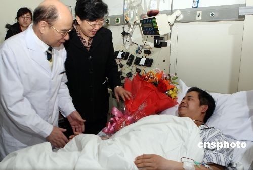 圖為中國(guó)紅十字會(huì)副會(huì)長(zhǎng)蘇菊香(中)、著名血液病專家、北京市道培醫(yī)院醫(yī)學(xué)總監(jiān)陸道培院士(左)來(lái)到采集室看望第四例造血干細(xì)胞捐贈(zèng)者陸先生。