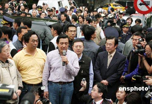 三月二十二日,二00八臺(tái)灣地區(qū)領(lǐng)導(dǎo)人選舉投票。中國(guó)國(guó)民黨候選人馬英九在臺(tái)北一個(gè)投開(kāi)票所投票后,接受眾多媒體的采訪(fǎng)。中新社發(fā) 黃少華 攝
