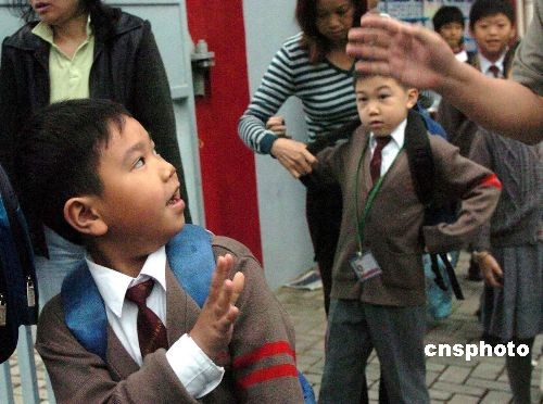 三月三十一日,早前曾有學童病逝的屯門順德聯誼總會何日東小學的學童回校上課。此前,香港全部小學、幼兒幼兒園和特殊學校停課兩周,以應對流感。中新社發 譚達明 攝