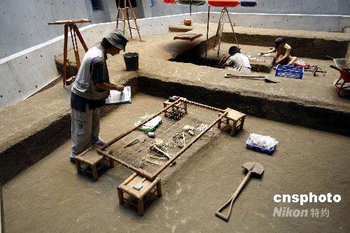 十三行博物館位于臺北縣八里鄉淡水河?诮唤缣幍哪习叮娣e約為62500平方公尺,在1989至1992年間,因為在遺址上興建八里污水處理廠,引發附近居民以及學者抗議。在社會輿論的聲援下,當局一邊開挖古物、一邊興建污水處理廠,最後在廠內保留出一塊古跡保護區,并在污水處理廠旁建造十三行博物館,保存出土文物。 1957年地質學者林朝綮在這里發現史前的煉鐵遺跡,同時亦發現許多史前陶片、石支腳與凹石等,因而判斷此處為史前遺址,并依據該地地名將它定名為十三行遺址。十三行人是目前臺灣唯一確定擁有煉鐵技術的史前居民,可能是臺灣平埔族凱達格蘭人的祖先。十三行文化屬于北臺灣地區的金屬器時代,時間大致從2300年前開始,到漢人進入本地區之后才結束。圖為重現當年考古發現的場景。中新社發 杜洋 攝