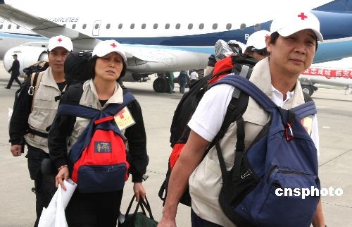 5月20日下午,以陳文長為領隊的臺灣紅十字醫療隊一行37人以“兩岸直航”的形式乘坐臺灣華信航空的專機抵達成都機場,之后即刻前往汶川大地震的重災區德陽市開展醫療救治。中新社發 任晨鳴 攝