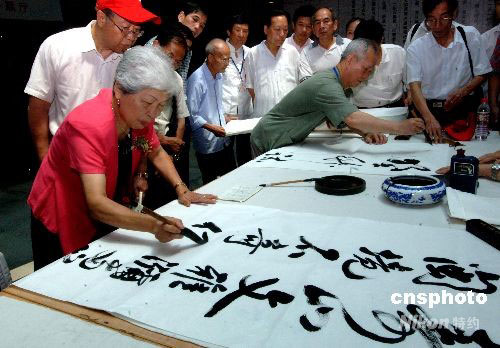 6月19日,參加海峽兩岸壽山石文化書法精品展的兩岸知名書法家,在福州博物館舉行交流筆會。圖為臺灣中國書法家學會理事長謝季蕓女士(左一)、臺灣中國書法家學會副理事長陳炫明在海峽兩岸書法家交流筆會上揮毫。中新社發 劉可耕 攝