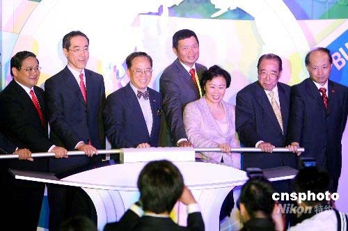 七月三日,為慶祝香港國際機(jī)場(chǎng)啟用十周年,機(jī)場(chǎng)管理局在港麗酒店舉行慶典及酒會(huì),香港特區(qū)行政長(zhǎng)官曾蔭權(quán)、政務(wù)司長(zhǎng)唐英年、機(jī)場(chǎng)管理局主席張建東等嘉賓主持慶典儀式。中新社發(fā) 洪少葵 攝