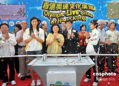 為營造熱烈的奧運氣氛,讓香港市民積極投入北京二零零八年奧運會,香港康樂及文化事務署七月八日宣布,將于八月奧運會舉行期間在維多利亞公園及沙田公園設立奧運文化廣場。圖為香港民政事務局常任秘書長尤曾家麗及康文署署長周達明與香港精英運動員、十八區區議會和體育總會的代表出席當日舉行的開展儀式。 中新社發 鄧慶樂 攝