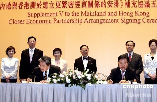 七月二十九日,《內(nèi)地與香港關(guān)于建立更緊密經(jīng)貿(mào)關(guān)系的安排》補(bǔ)充協(xié)議五簽署儀式在香港政府總部新翼一樓會(huì)議廳舉行。在行政長官曾蔭權(quán)等嘉賓的見證下,財(cái)政司司長曾俊華與商務(wù)部副部長姜增偉簽署補(bǔ)充協(xié)議五。中新社發(fā) 張勤 攝