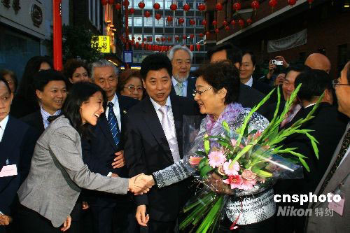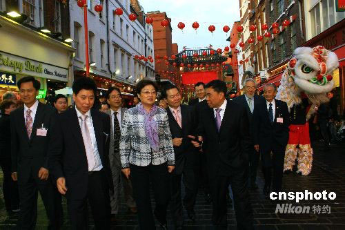 當?shù)貢r間9月12日傍晚,中國國務院僑辦主任李海峰一行在倫敦唐人街參觀訪問,在華人僑領的陪同下參觀唐人街。中新社發(fā) 李鵬 攝