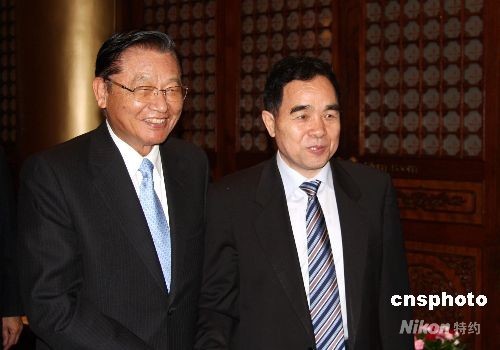9月19日,臺(tái)灣海基會(huì)董事長(zhǎng)江丙坤在臺(tái)北圓山飯店,會(huì)見(jiàn)率團(tuán)前來(lái)臺(tái)灣參加海峽兩岸出版交流二十周年紀(jì)念活動(dòng)的部分大陸代表團(tuán)成員時(shí),與新聞出版署署長(zhǎng)柳斌杰(右)在一起。中新社發(fā) 陳立宇 攝