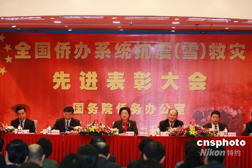 9月28日,國務院僑辦在北京召開僑辦系統抗震(雪)救災先進表彰電視電話會議,對全國僑辦系統在抗震(雪)救災斗爭中表現突出的50個先進集體和100名先進個人予以表彰。中新社發 鄭雄增 攝
