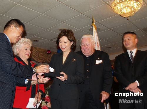 當地時間9月29日,美國勞工部長趙小蘭到洛杉磯向亞裔民眾說明美國經濟低迷“解套”辦法,為民眾打氣。加州眾議員陳文、核桃市議員林恩成、鉆石吧市議員張文彬等華人民選官員陪同參加。圖為華人代表向美國勞工部長趙小蘭贈送紀念品。 中新社發 盧威 攝