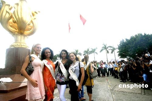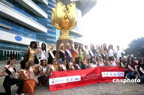 十月三十一日,澳門威尼斯人第四十八屆國際小姐選美大賽2008候選佳麗遨游香港,并在金紫荊廣場合影。中新社發 張勤 攝