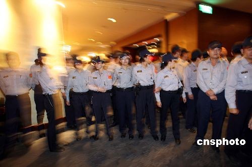 十一月五日晚,國(guó)民黨主席吳伯雄在臺(tái)北晶華酒店宴請(qǐng)海協(xié)會(huì)會(huì)長(zhǎng)陳云林一行。警方重兵把守酒店外圍,有人士沖擊晚宴會(huì)場(chǎng),在徒勞無(wú)功下與警方發(fā)生激烈推撞。中新社發(fā) 洪少葵 攝