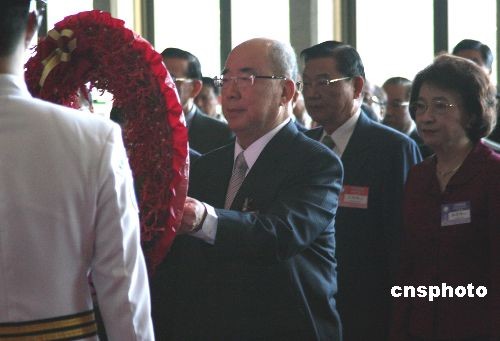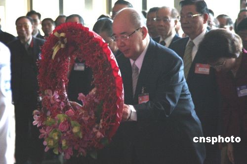 11月22日,中國(guó)國(guó)民黨第十七次全代會(huì)臨時(shí)會(huì)議在臺(tái)北“國(guó)父紀(jì)念館”舉行。圖為會(huì)議前,國(guó)民黨主席吳伯雄率黨內(nèi)同仁在紀(jì)念館內(nèi)向中山先生銅像獻(xiàn)花致敬。中新社發(fā) 劉舒凌 攝