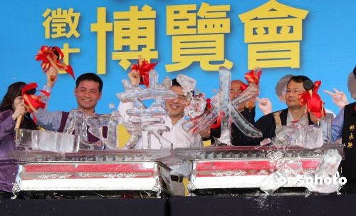 12月20日,在2008臺灣百大服務(wù)業(yè)征才博覽會上,臺北市長郝龍斌率眾嘉賓錘擊“就業(yè)冰河”四字。鼓勵(lì)大家齊心抗擊“失業(yè)潮”。中新社發(fā) 陳立宇 攝