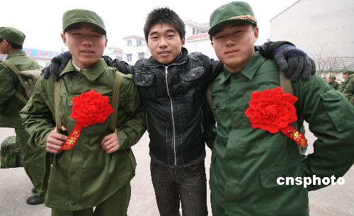 12月11日下午,家住安徽蒙城縣漆園辦事處城北村的雙胞胎兄弟鄭根林、鄭隨林同時參軍,起程開赴各自部隊開始多彩的軍營生活。鄭家兄弟自幼羨慕軍營生活,今年冬季征兵開始后,兄弟倆一起報名參加體檢和政審,并雙雙通過,被解放軍某部和武警某部批準入伍,雙胞胎兄弟同時參軍入伍在當地傳為佳話。中新社發 胡衛國 攝