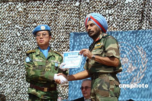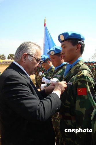 2月7日,聯合國駐蘇丹特派團(聯蘇團)在中國的傳統節日--春節這一天舉行隆重的授勛儀式,破例提前兩個月為中國赴蘇丹瓦烏435名維和官兵授予聯合國“和平榮譽勛章”,以表彰他們在執行任務時的卓越表現。聯合國秘書長駐蘇丹特別代表卡齊先生、聯蘇團總司令里德爾中將從首都喀土穆趕來親自為維和官兵授勛并與官兵一起歡度春節。中新社發 甄玉改 攝