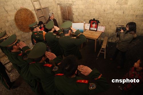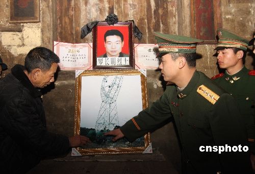 2月20日,武警湖南總隊婁底市支隊官兵來到湖南省漣源市白馬鎮楊世村,給在除冰搶險中英勇殉職的電力英雄羅長明、羅海文烈士家屬送去了湯圓、水果、慰問金等元宵節禮物。當天,剛剛從搶修500千伏的五民線路(英雄生前搶修過的電網)歸來的武警婁底市支隊官兵來到烈士家中。向烈士遺像前深深鞠躬,送來了一份特殊的慰問禮物——兩幅用鏡框鑲嵌裱好的照片,這正是烈士生前搶修電網時倒塌的43號鐵塔。英雄辭世后,武警官兵接過烈士手中的槍,繼續英雄生前未盡的事業,經過十幾天的緊急搶修,現在43號鐵塔重新矗立,整條線路順利通電。中新社發 郭國權 攝