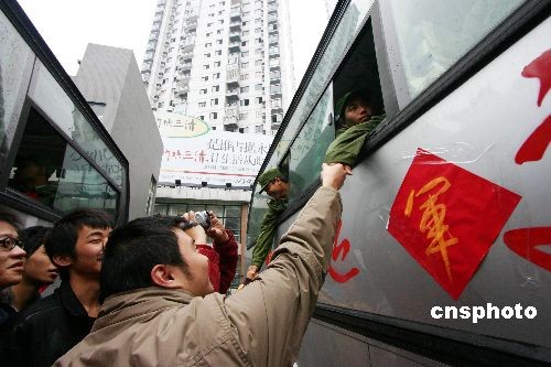 11月19日,進藏新兵在親人們的歡送下離開家鄉。當日,重慶市永川區首批進藏新兵在區人武部大院集中,完成了相關交接手續后,新兵們在親人的祝福聲中,登上大巴車依依不舍地告別親人、告別故鄉,踏上了保家衛國的征程。中新社發 陳仕川 攝