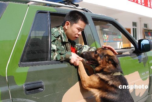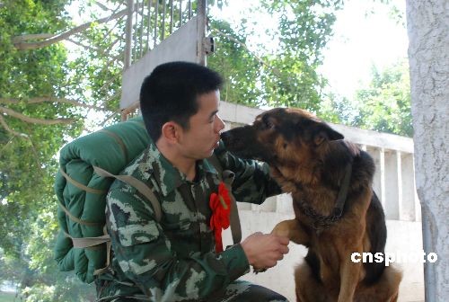 十一月二十四日,武警福建總隊直屬支隊的訓犬員張世均與息息相處五年的無言戰友“飛虎”依依惜別。又到老兵退伍的日子,在武警福建總隊服役期滿的三千多名老兵,開始踏上返鄉的路程。中新社發 曾朝群 攝