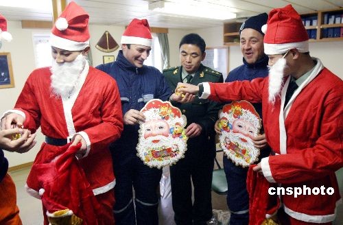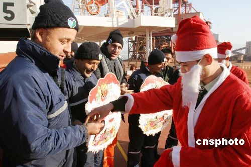 圖:邊防戰(zhàn)士扮"圣誕老人"為外籍船員送祝福