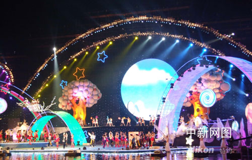 第四屆中國(guó)國(guó)際動(dòng)漫節(jié)開(kāi)幕式晚會(huì)現(xiàn)場(chǎng),晚會(huì)由“心”、“情”、“夢(mèng)”三個(gè)篇章組成,充分體現(xiàn)了“多彩動(dòng)漫品質(zhì)生活”的主題。 周翌 攝