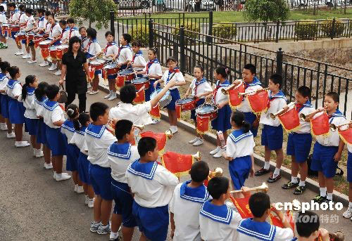 9月10日早上,在遼寧省大連市甘井子區金二小學學校門前,鼓樂喧天,學生們將鮮花獻給每位老師,表達對老師的節日祝福。當日是我國第24個教師節,各地院校師生開展多種形式的活動,慶賀教師節。中新社發 劉德斌 攝