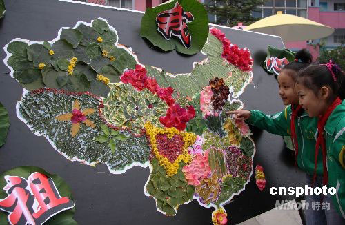 9月27日,山東省棗莊市市中區回民小學開展“我為祖國增紅添綠”創意活動,學生們巧妙地運用各種樹葉和鮮花制作出“中國地圖”,表達對偉大祖國的美好祝福,迎接國慶佳節。中新社發 吉 喆 攝