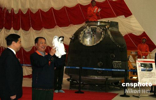 10月1日上午,神舟七號載人飛船返回艙在其誕生地——中國航天科技集團公司所屬中國空間技術研究院舉行開艙暨搭載物交接儀式,伴隨三位中國航天員太空飛行六十八小時二十七分鐘的一批特殊“乘客”一一精彩亮相,隨后各歸其主。圖為中國載人航天工程航天員系統總指揮兼總設計師、中國航天員科研訓練中心主任陳善廣展示將由該中心珍藏、首次成功使用過的“飛天”艙外航天服手套。中新社發 孫自法 攝