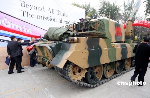 10月28日,一輛軍綠色、價值300多萬元的“消防坦克”亮相2008北京國際消防設備技術交流展。據悉,消防坦克是由中國軍用坦克改裝而成的。它采用特種裝甲鋼板制成,自重大約35噸,裝配有直流有線電控自動炮、高壓水泵、可燃和有毒氣體探測儀及防火直流照明燈,馬力很大,最高時速可達70多公里。中新社發 吳芒子 攝